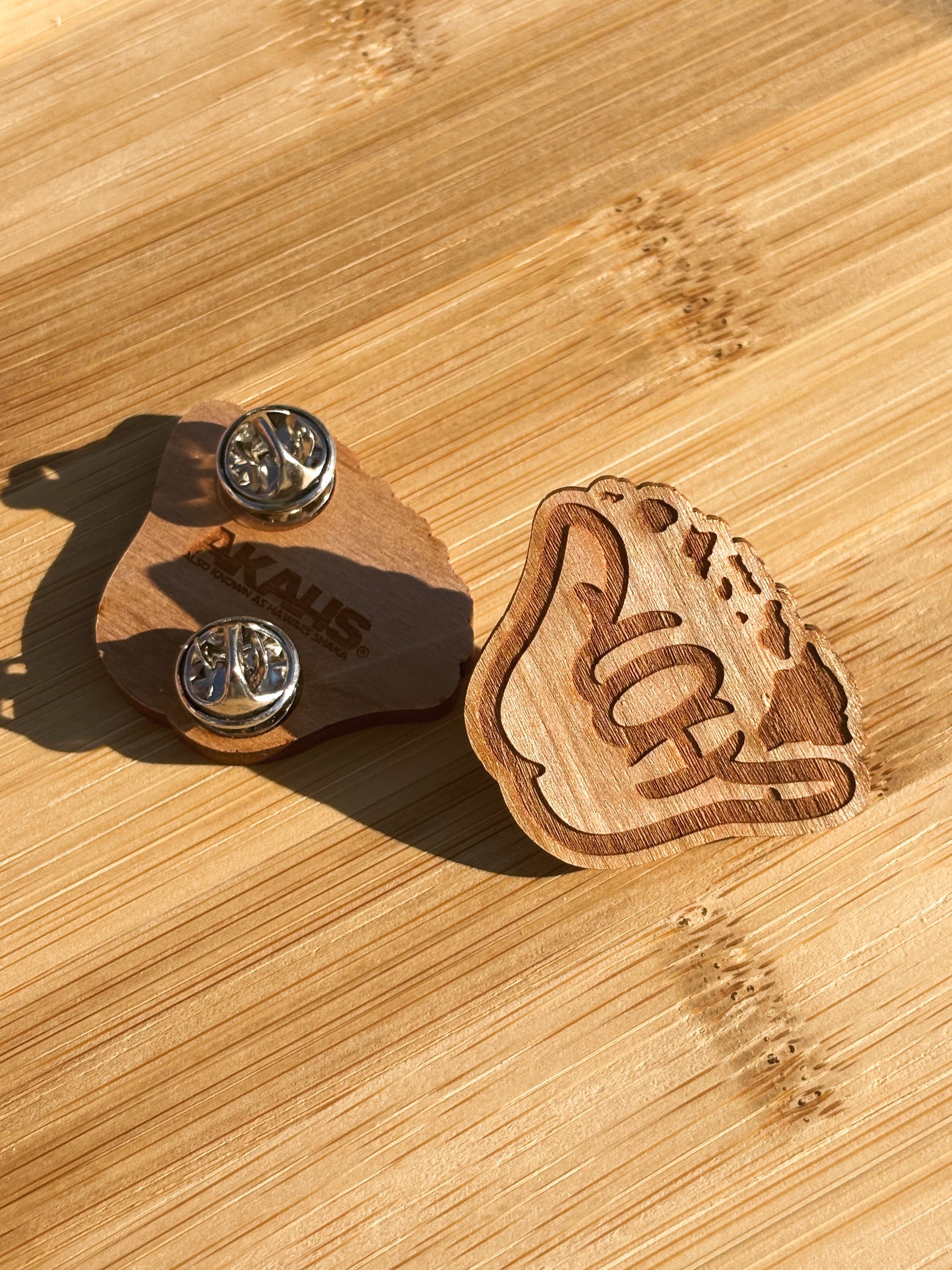 Our Aloha Shaka icon as a wooden pin with the AKAHS branding on the back