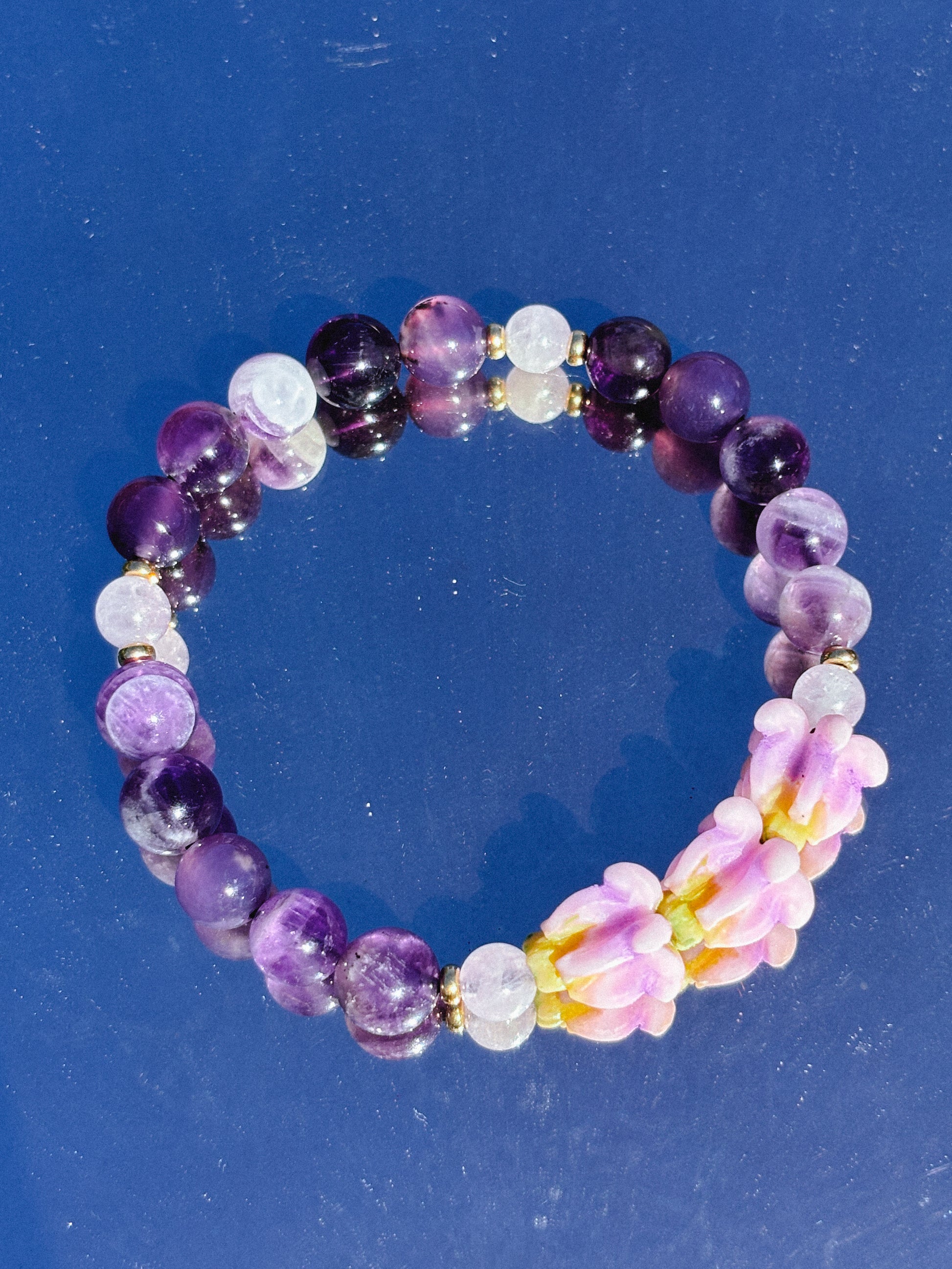 Our loved purple Crown Flower is beautifully paired with Amethyst beads, creating a enchanting bracelet to elevate your jewelry stack.
